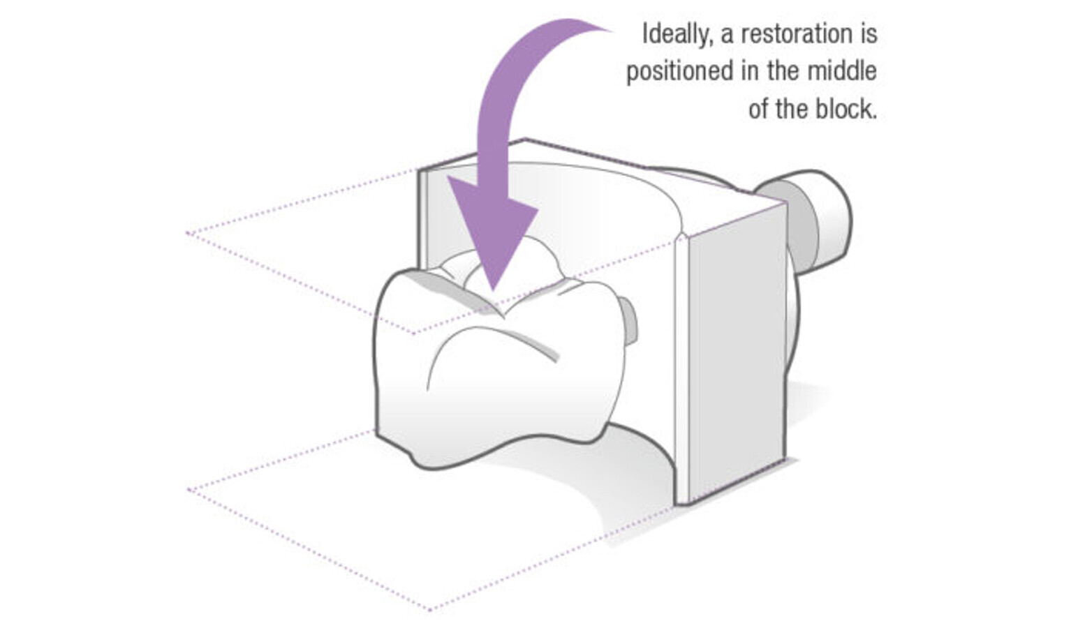 What is the best position of the restoration in the block to leverage all benefits related to the multilayered structure? Ideally, a restoration is positioned in the middle of the block (Fig. 2). In addition, the selected block should be one shade darker than the determined shade. This will lead to a natural shade appearance of the resulting restoration. If the restoration is placed at the upper margin of the block, parts of the body shade—and with it chroma—will be lost, which will make the restoration appear too light.